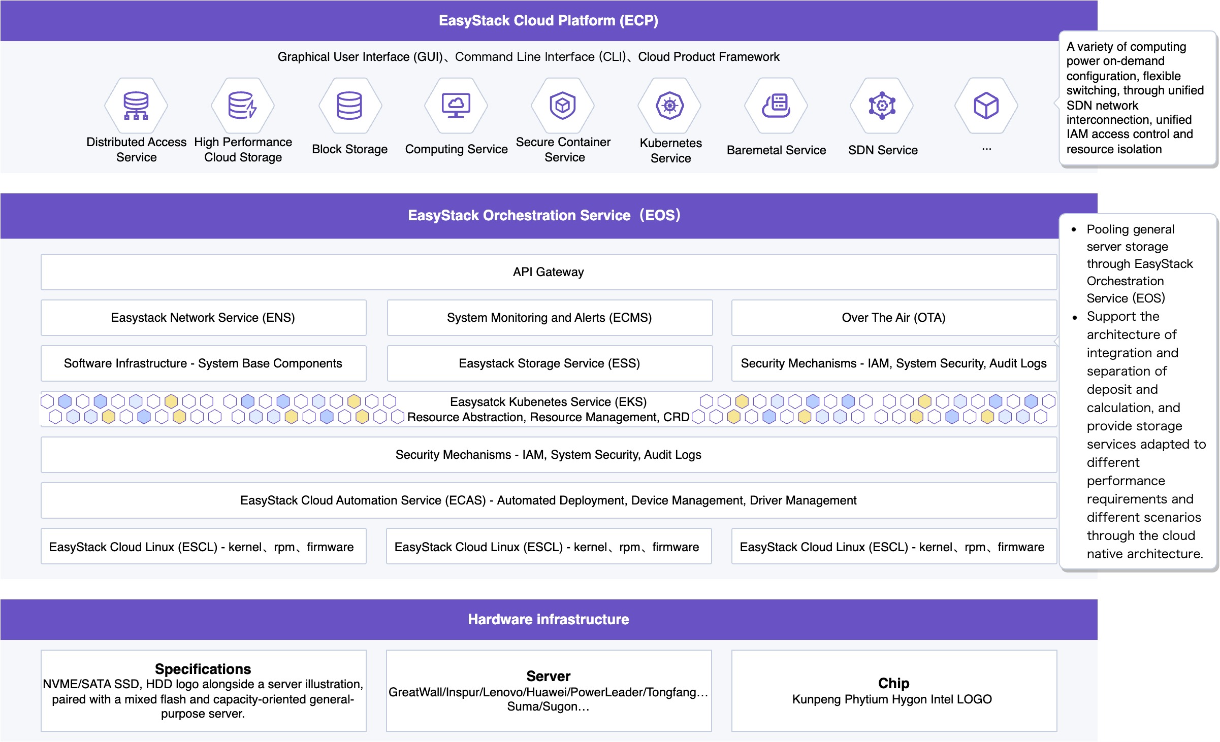 Provide both capacity-based and performance-based storage space on demand within the same storage pool. Simultaneously supports cloud computing power, bare metal computing power, and container computing power. Fully compatible with various CPU architectures such as x86, C86, ARM, etc., supporting various forms of storage media such as SAS&SATA HDD, SATA SSD, M.2 SSD, PCIe&U.2 NVMe SSD, etc. Diversified and unified, meeting the storage needs of diverse application scenarios.